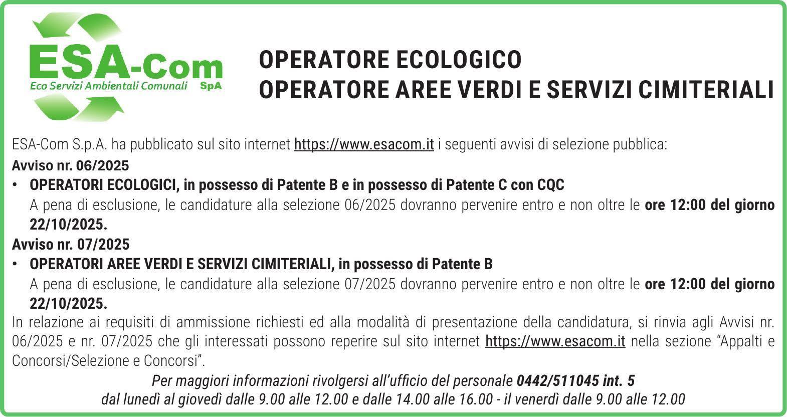 Esa-com Spa ha pubblicato due avvisi di selezione pubblica per l'assunzione di personale. Di seguito i link: